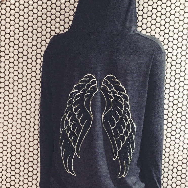 Aw it's okay! We get that a lot. It's a legitimate problem! Meet our best selling OG Hoodie - which when first launched sold right out. A charcoal grey pullover hoodie with silver & black wings on the back. Perfect to wear just about anywhere or tie around your waist. Caution: may lead to obsession and separation anxiety when not being worn.
